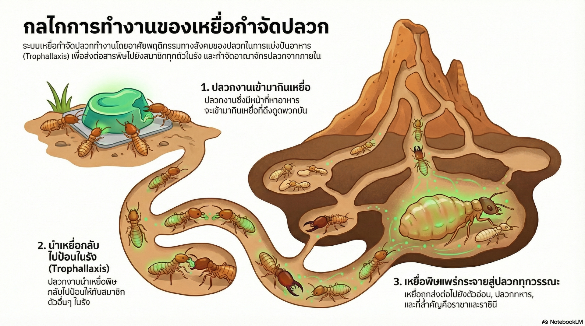 5. การกระจายเหยื่อภายในรังปลวก ปลวกนำเหยื่อกลับไปยังรัง มันจะทำการแบ่งปันเหยื่อให้กับปลวกตัวอื่นๆ ซึ่งจะส่งผลให้ปลวกในรังทั้งหมดได้รับเหยื่อที่ส่งผลกระทบต่อการลอกคราบของปลวก โดยไม่ตายทันที แต่จะ ทำให้ปลวกทั้งรังตายยกรัง